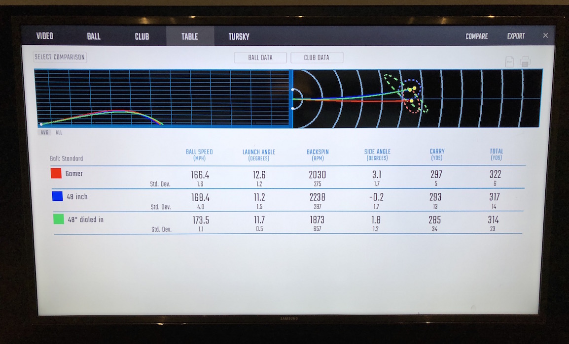 During the recent 48-inch driver test, I hit three shots with my gamer driver to get baseline results. As you’ll see in the data presented below, my swing speed was 115 mph, average ball speed was 166.4 mph, launch was 12.6 degrees, I was seeing 2030 rpm of spin, averaged 13.7 feet offline, carried it 297 yards and totaled 322 yards on average. I must say, I’m satisfied with both distance and dispersion from the gamer, and these numbers do accurately represent the performance I have being seeing of late.