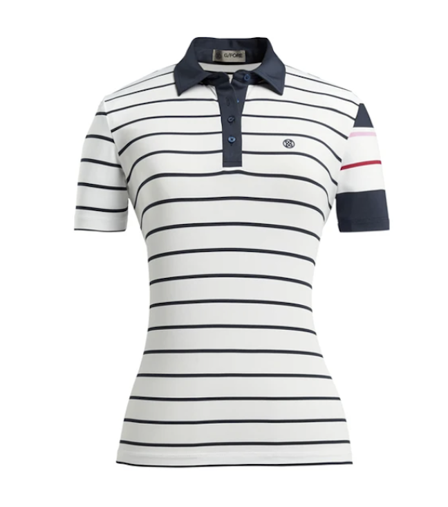 This modern twist on a classic striped polo is perfect for trendy-yet-traditional ladies.