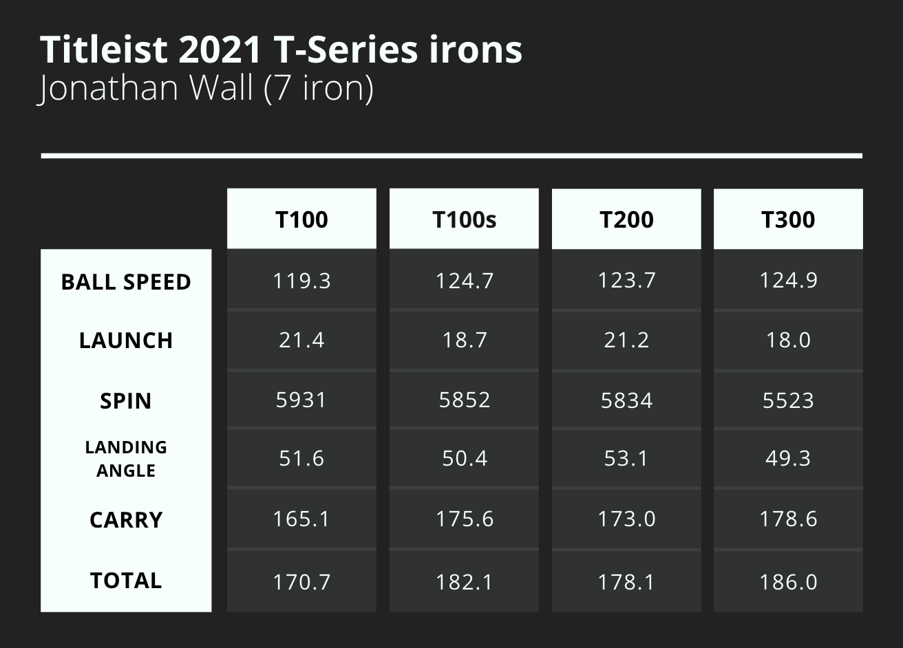 My biggest takeaway from the results is that each of the Titleist irons did what they’re designed to do. The T100 irons offered the most spin and the shortest distances, while the T300 produced the lowest spin and the most distance. Between those two models, the T300 flew 19.3 yards farther than the T100 irons.