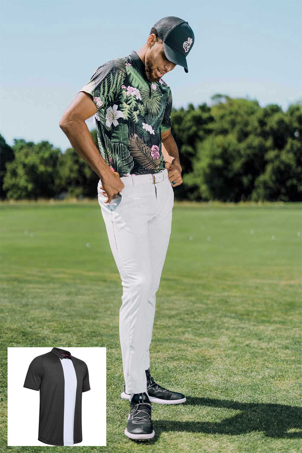 The SC30 Range Unlimited capsule collection for Under Armour dropped this fall. The 14 pieces include headwear, socks and apparel, and are highlighted by the Curry 6 SL spikeless golf shoe, which is modeled after Curry’s namesake UA basketball shoes. The entire collection is available for purchase at underarmour.com. Here’s what Steph is rocking in the photo below: