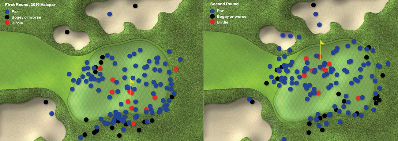 At the 2019 Valspar Championship at Innisbrook Resort in Tampa, Fla., players hit 427 tee shots into the par-3 15th. Extrapolate all that data (part of which you can see in the illustrations lower on the page) and it looks like a blast from the world’s largest shotgun. But if you take a closer look, you can start to see clues about how to better manage your game and shoot lower scores.