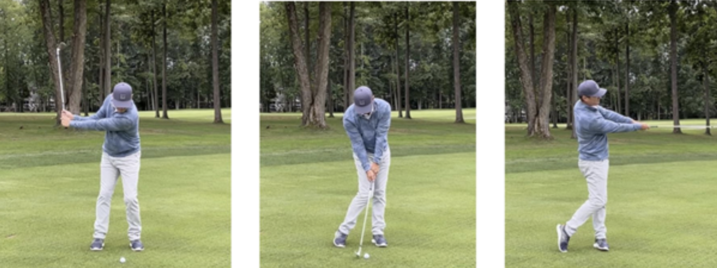 As the photo above shows, the length of the backswing matches the length of the follow through, and the right knee gets to the ball before the clubhead.