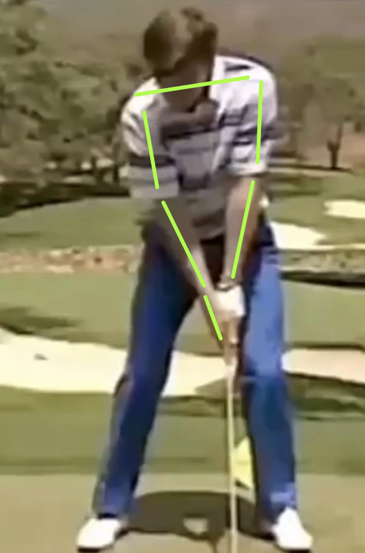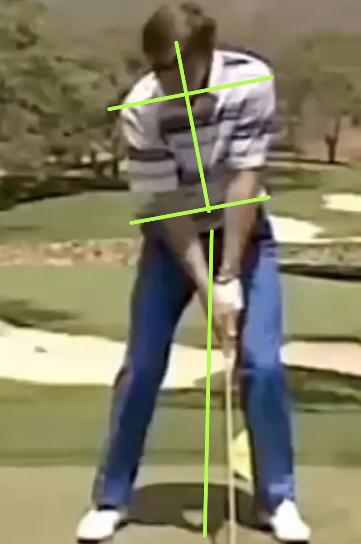 With the arm structure above, this allows your upper body to be slightly behind your lower body. This is the proper position of the body at impact. Note that the shoulder line also matches the eye line in Faldo’s setup.