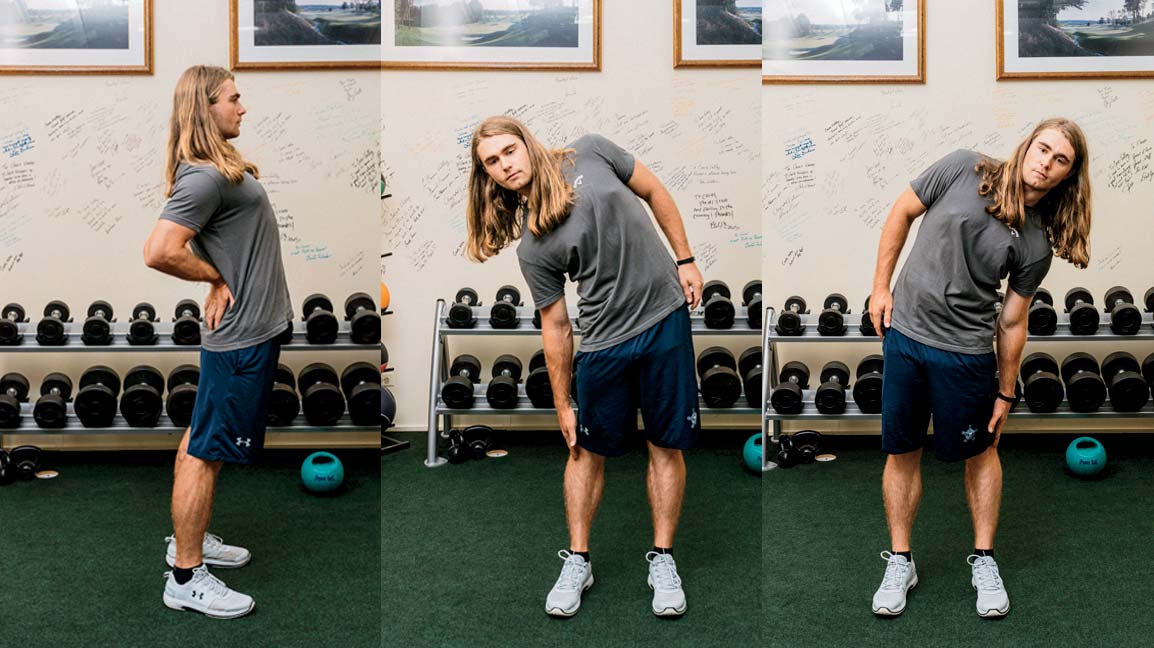 Simple back-bend stretches increase your spine’s range of motion, allowing you to get your hands higher on your backswing — one of my trademark power moves. While you’re at it, do side-bend stretches, sliding each hand as far down each side of your body as you can. Creating more side bend during exercise allows you to maintain correct posture when you swing — especially when swinging at top speed.