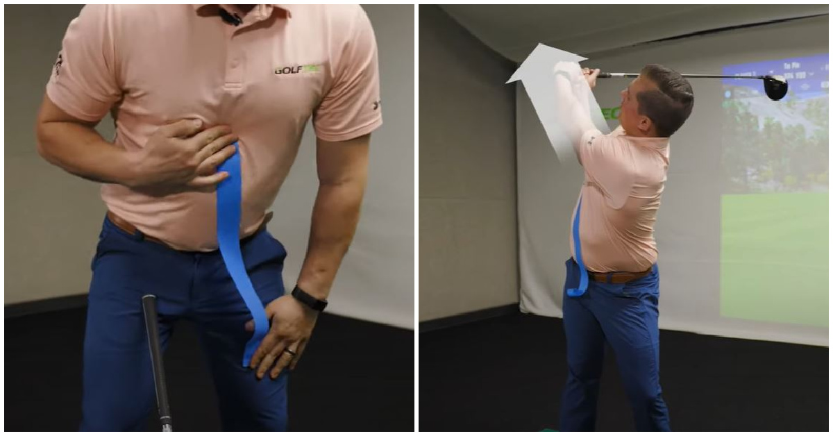 Which is where the piece of tape comes in. Pull a piece about two feet long and attach it from the center of your chest to your lead thigh (for right-handed golfers, that means their left thigh). Once you do that, your goal is to make your backswing and separate the tape from yourself so it’s no longer attached at the top of your backswing. This’ll improve your backswing in two ways.
