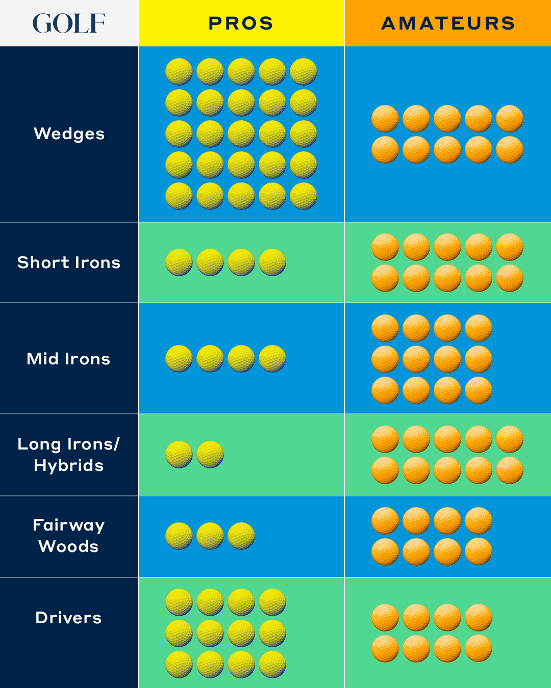 Using a 50 ball warm-up session as a guideline, average golfers tend to work their way evenly throughout their bag, with a particular focus on mid-irons. Pros on the other hand, seem to focus far more on wedges and drivers — two of the most important clubs in the bag. They work on hitting lots of different shots with their wedges, and different shot shapes with their driver.