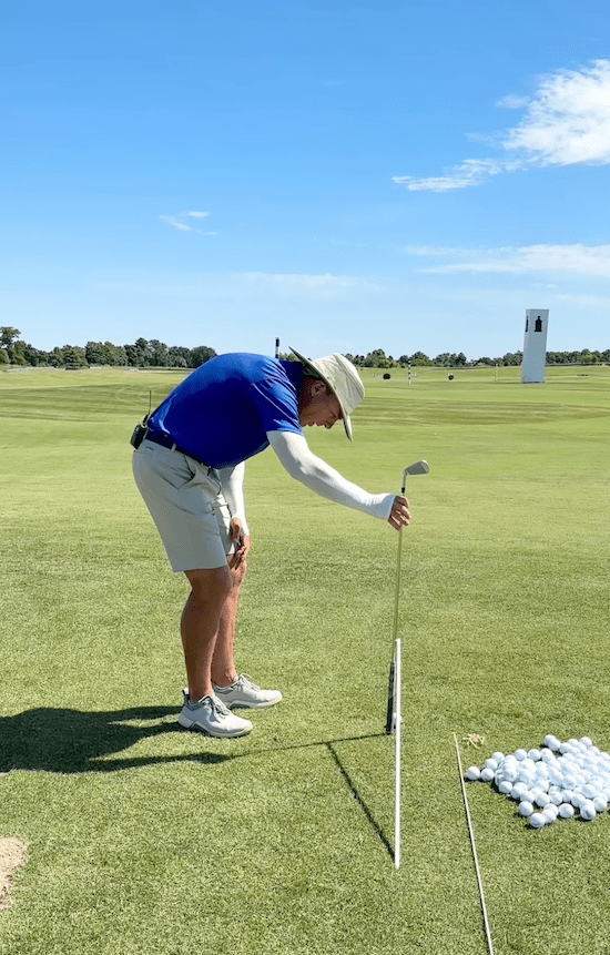 “Put an alignment rod into the ground and point it straight to your target,” he explains. “I’ve got the tip of the alignment rod about a grip length up off the ground, and I’m going to tee a golf ball directly underneath the tip of that alignment rod.”
