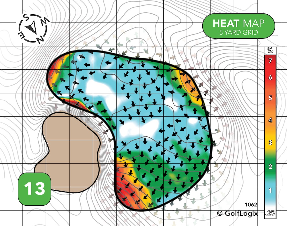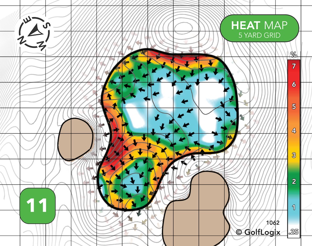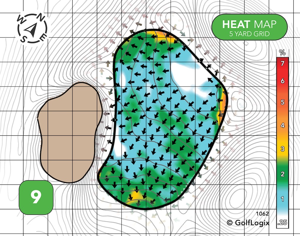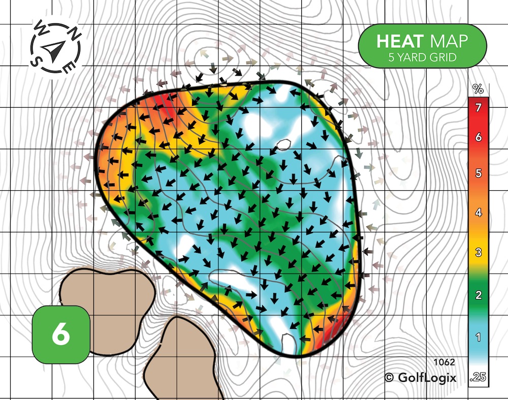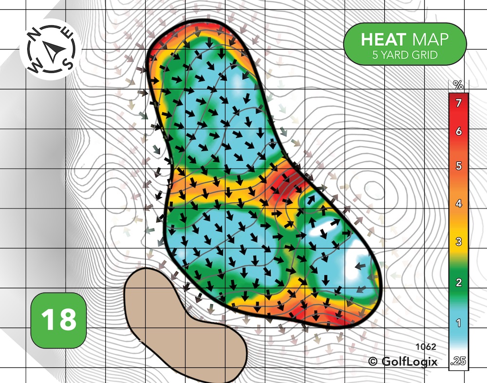 The most dangerous part of this green is the potential of your ball running off into one of those valleys long left or long right. If you can avoid that, most of the rest green features some pretty subtle breaks.