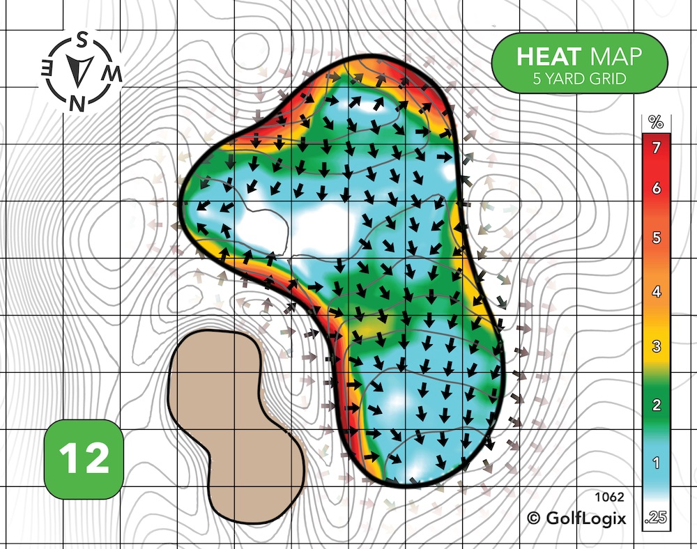 The green itself isn’t the issue on this ~230-yard par-3, it’s the shot into the hole. The primary concern is trying to make sure the ball doesn’t run off the back/back-right; the rest of the green itself is pretty flat.