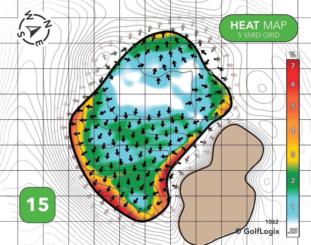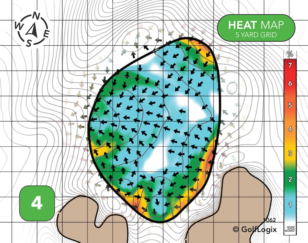The green runs almost exclusively back-to-front. Hitting your ball past the pin, if the hole is up front, could leave you with a slippery putt, and a drop-off long right could threaten those who try to get greedy if and when the pin is on that crown.