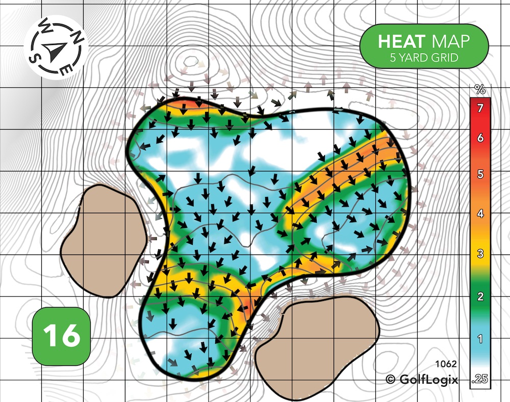 Two different ridges effectively cordon-off the green into three sections: Very front-left, back-right, and everywhere else.