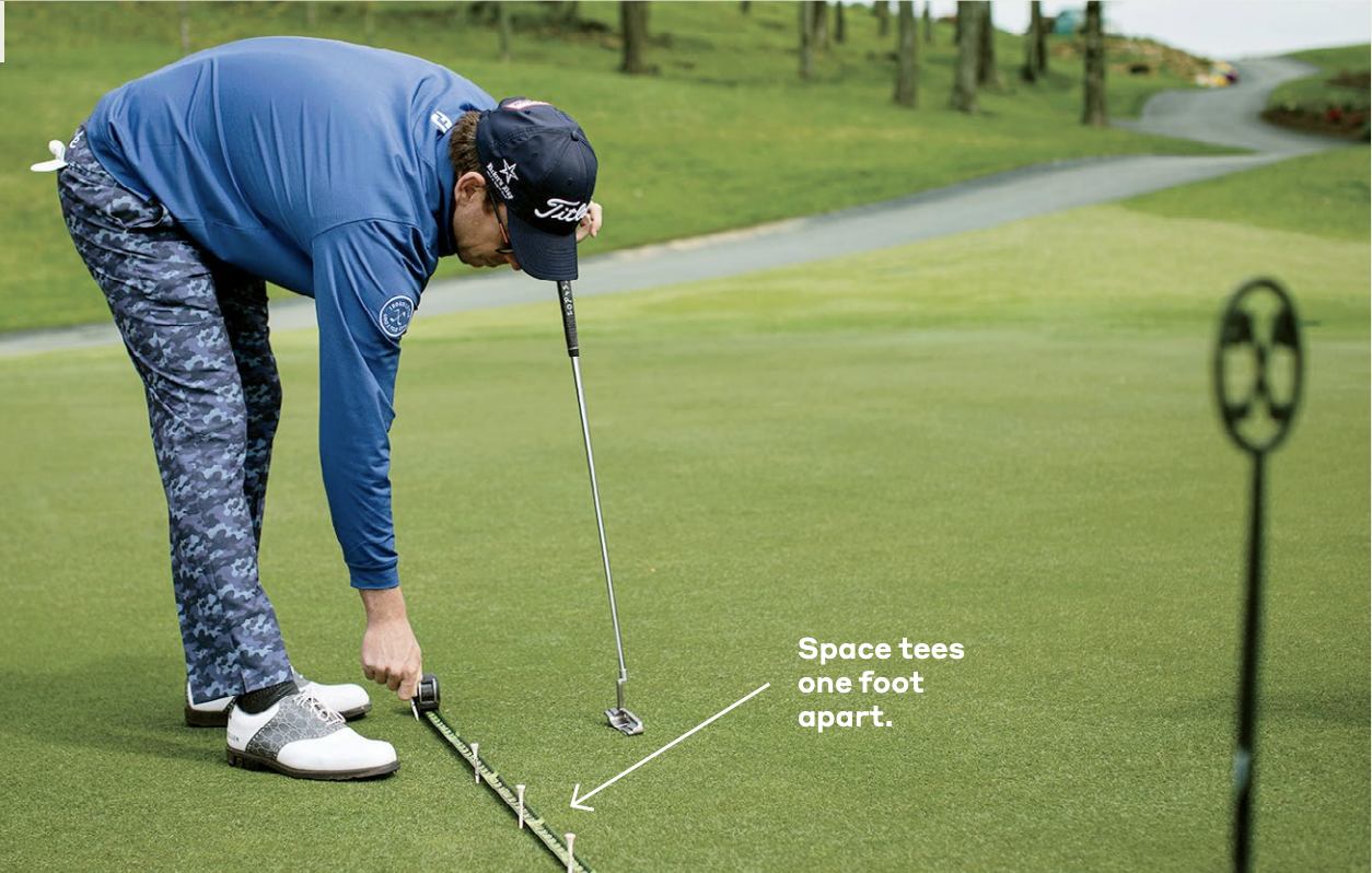 2. Begin hitting putts, moving around the hole so you never putt in the same direction twice in a row. (You’re going to do this in each of the four directions around the cup, which means you’ll need 20 tees total.)