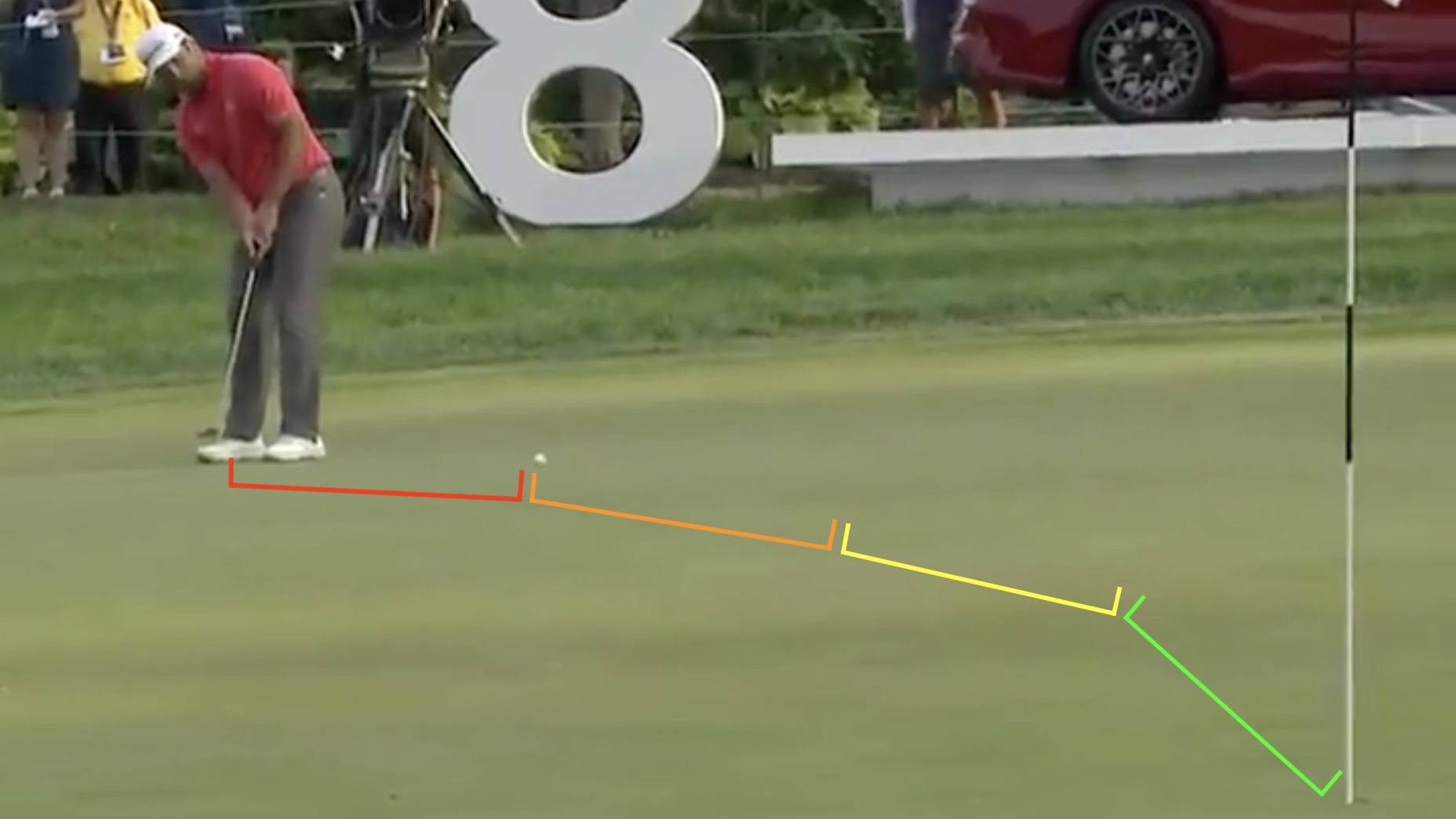 When it comes to long putts, Rahm approaches this step by taking a long putt and mentally breaking it into four parts. So, instead of planning for one 66-footer, like he had on Sunday, he pretends he has four separate 16 foot putts. He reads each part of the putt individually, which he says helps him focus on the details of each part.