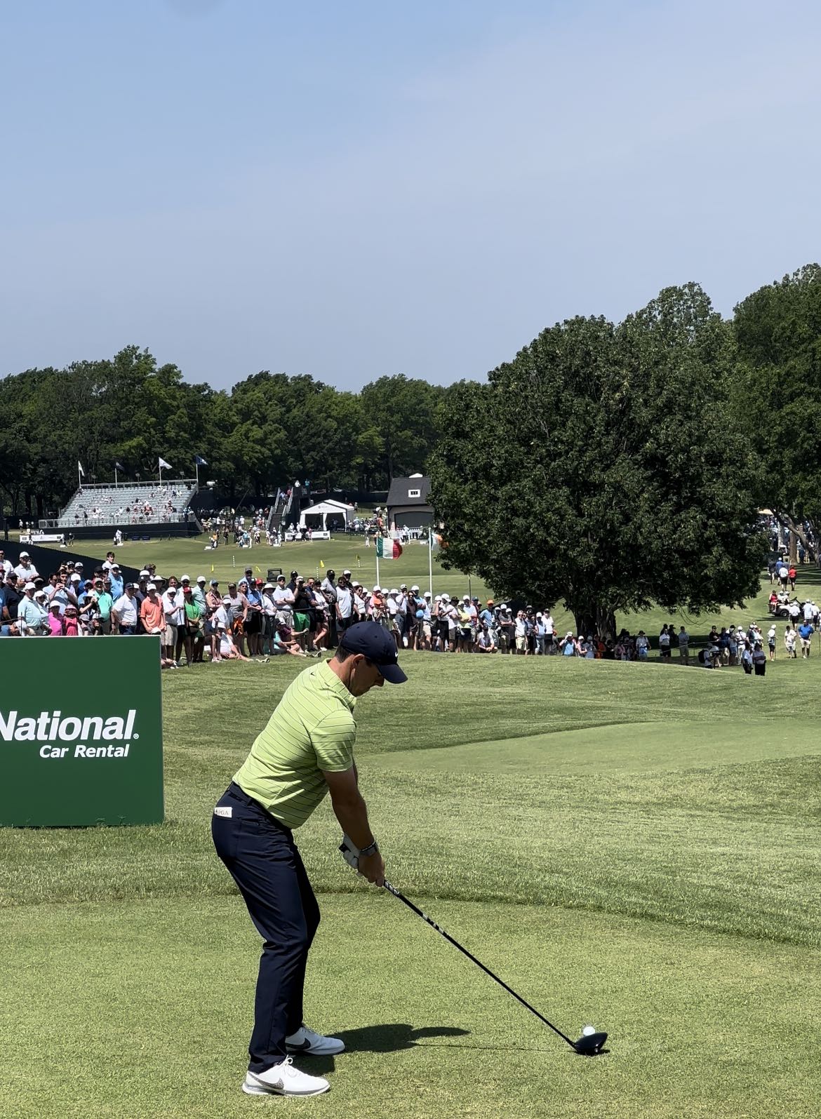 When he arrived on the 5th hole on Thursday, during his first round, he aimed on the left side of the tree left of the left bunker — almost to the driving range — and hit a high, hard push-cut. The ball launched into the sky, and when it finally came back to earth more than seven seconds later, it was 369 yards down the middle of the fairway. With one swing, Rory had gained almost a third of a shot on the field. He hit an iron into the greenside bunker, and walked away with his sixth birdie of the day.