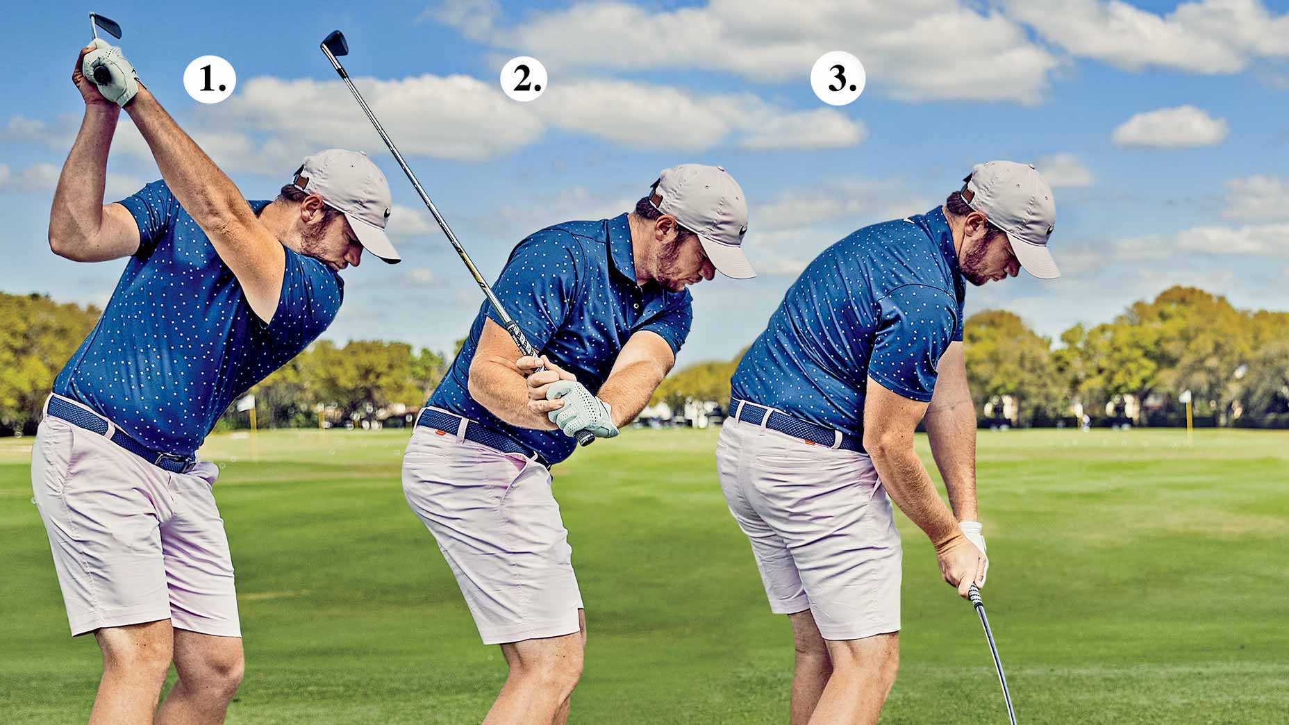 Sam has a tendency to “stack” on his left side and set the club with too much wrist hinge. We’re working on feeling “taller” here, with less wrist hinge (I call it the Steve Stricker position), and feeling like 90 percent of his weight is on his right leg. (Photo: Christopher McEniry)