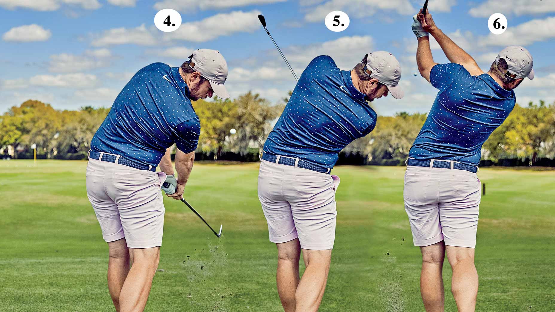 Sam’s a good athlete, and you can see it here. His weight has shifted to his front side, he’s standing tall and continuing to rotate. He knows where this ball is going: dead at the pin.