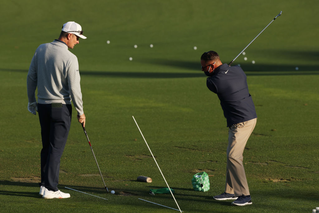 On the range this week at Augusta, Rose has been practicing with a specific range setup: Two parallel alignment rods on the ground, one along his foot line and the other along the target line. The alignment rod closer to his feet is to make sure he sets up square to the target; the target line rod is there to provide a visual cue for Rose so he knows where the target line is as he swings.