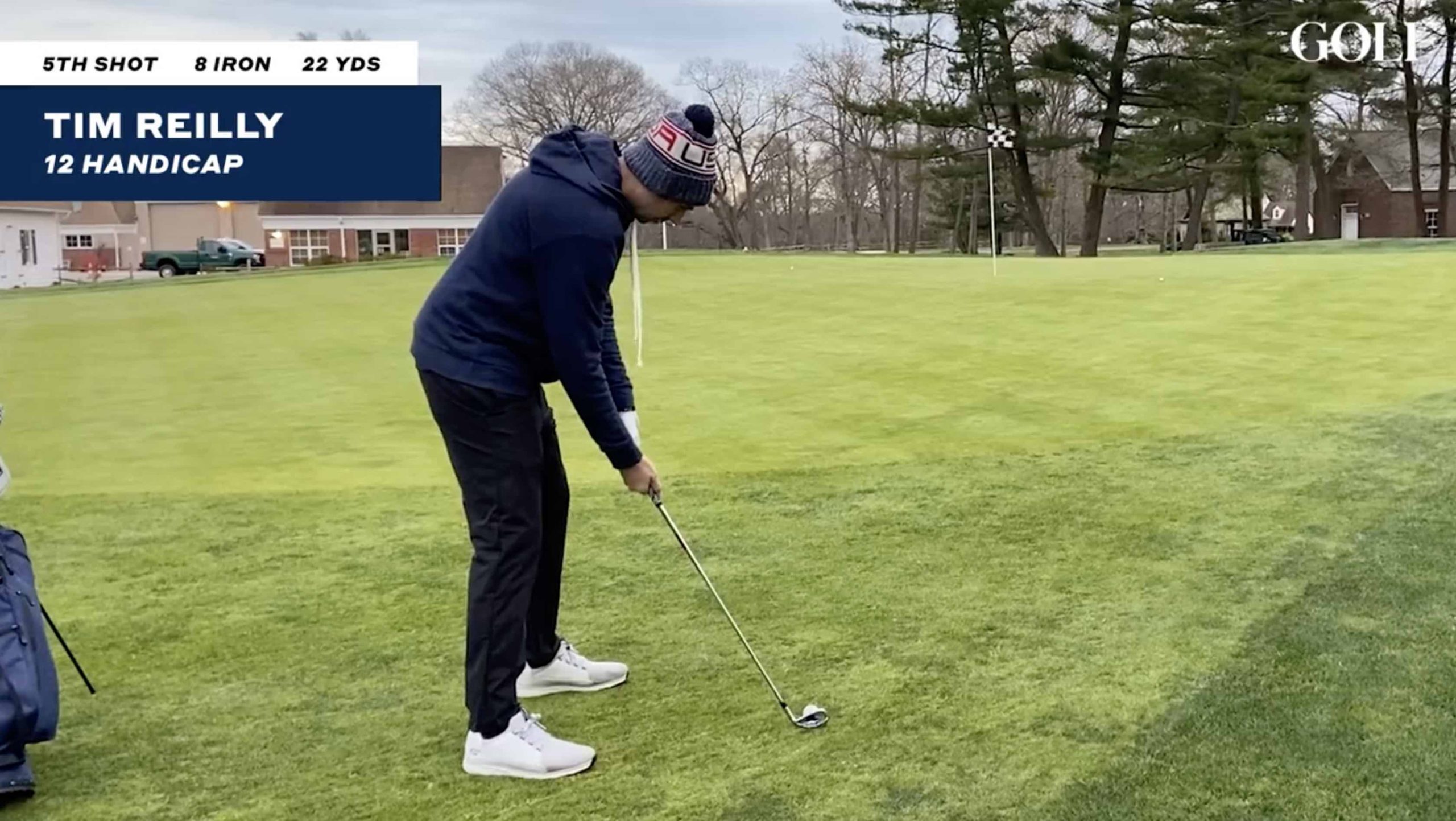Tim’s a wily player, the kind who routinely wins matches around the office. The strength of his game is his accuracy, especially off the tee: He’s good at keeping the ball in play, and avoiding big numbers because of it. 605 yards is just a lot of golf hole for Tim, but he progressed the ball well enough to find himself greenside in four shots. His problem was the bump-and-run he played next. Teachers suggest standing closer to the ball, choking up on the club and playing the ball back in your stance. Tim set up to the shot more like a standard shot, which meant it didn’t have enough juice to get back to the hole and leave himself a makeable putt. It wasn’t the wrong shot selection, just the wrong execution.