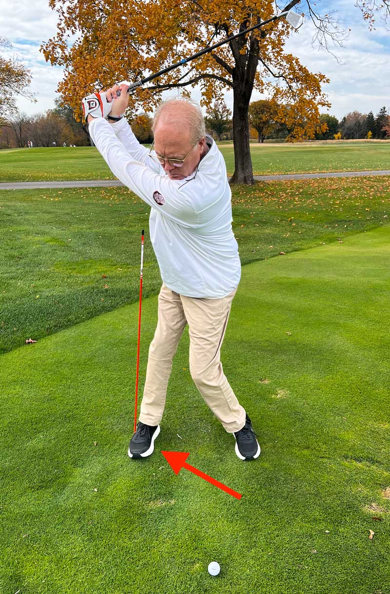 As you begin your backswing with your nose over the ball, you should keep your nose in this position until you’ve reached the top of your swing. Do not shift, slide or sway while turning to the top of your swing. Good players create power by pivoting/turning their right hip inside the right foot. Turning your right hip back over the right heel and not getting outside of the right heel will create tremendous torque and power. You should feel pressure on the inside of the right foot (photo, below).