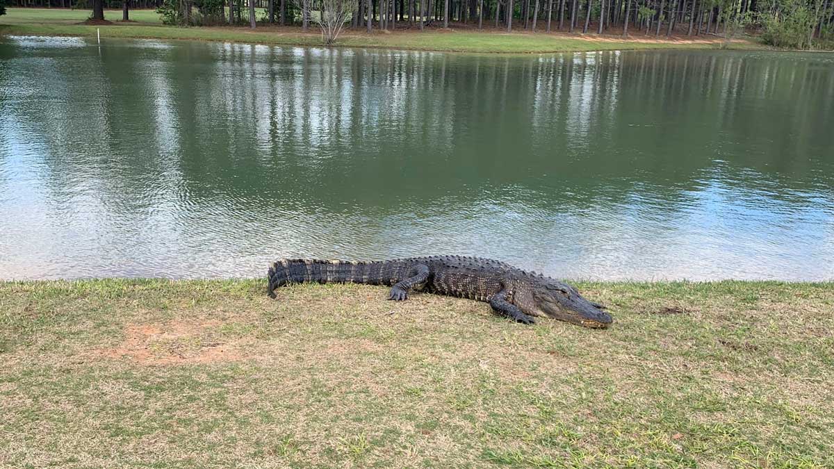 Golfers can’t take their eyes off of gators — witness this YouTube video we posted a few years back that has racked up 30 million views. I had my first encounter with a course gator this spring. While many of my coworkers enjoyed their week covering the Masters at Augusta National, I spent my Masters week looking for the best Augusta-area tracks at which to tee it up. I really enjoyed the gritty 18 at Applewood Golf Course in Keysville, Ga. My local playing partners were excited to take this New Yorker as close as possible to the large, napping reptile laying out near the water on 14. When we hit the brakes on the cart, that was the only split second this gator opened his (her?) eyes, and it couldn’t be less bothered by our presence. I snapped this picture, and fortunately our new friend didn’t return the favor. — Connor Federico