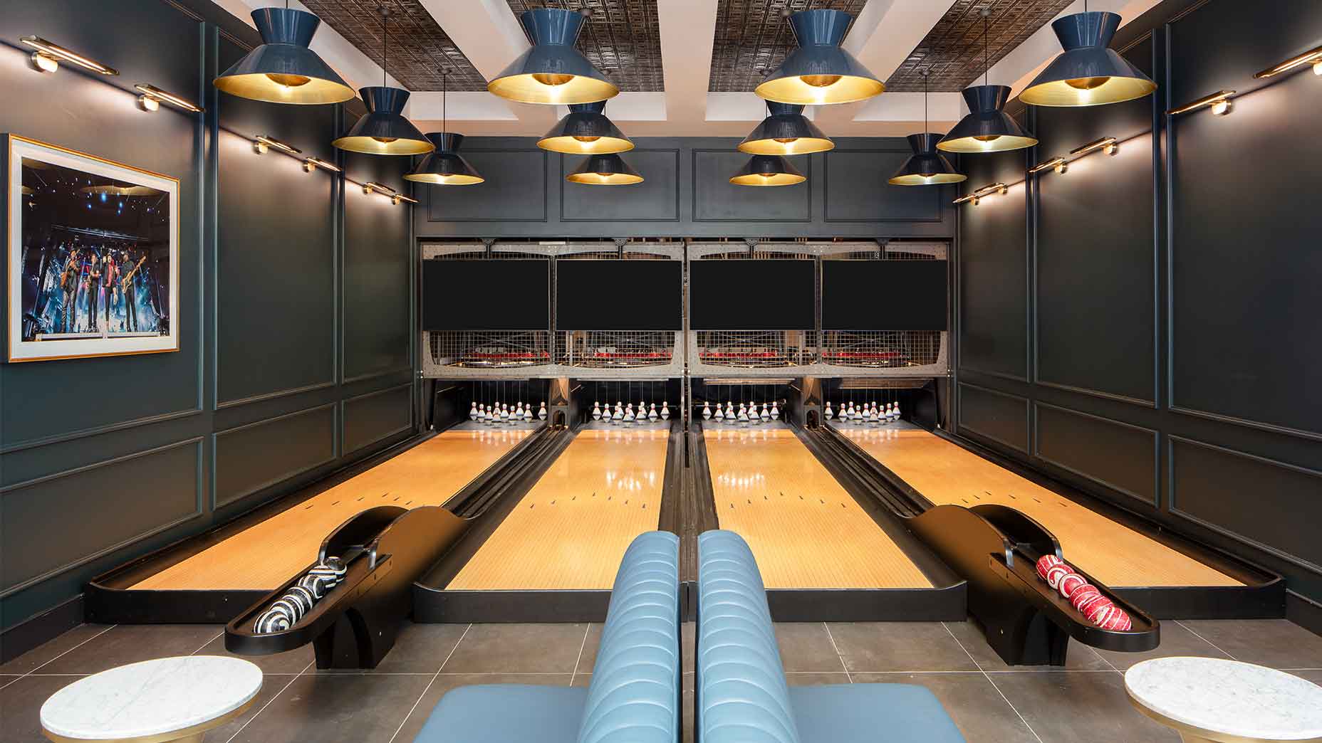T-Squared sports fans will be enticed by the space’s suite of gaming goodies, which include four multi-sport Full Swing golf simulators and state-of-the-art hitting bays, a duckpin bowling alley, and dart boards. T-Squared immediately becomes one of the city’s only indoor golf entertainment offerings, not to mention one of its glitziest. As Woods said in a release, “Justin and I thought it would be cool to create a place that combines our favorite things.”
