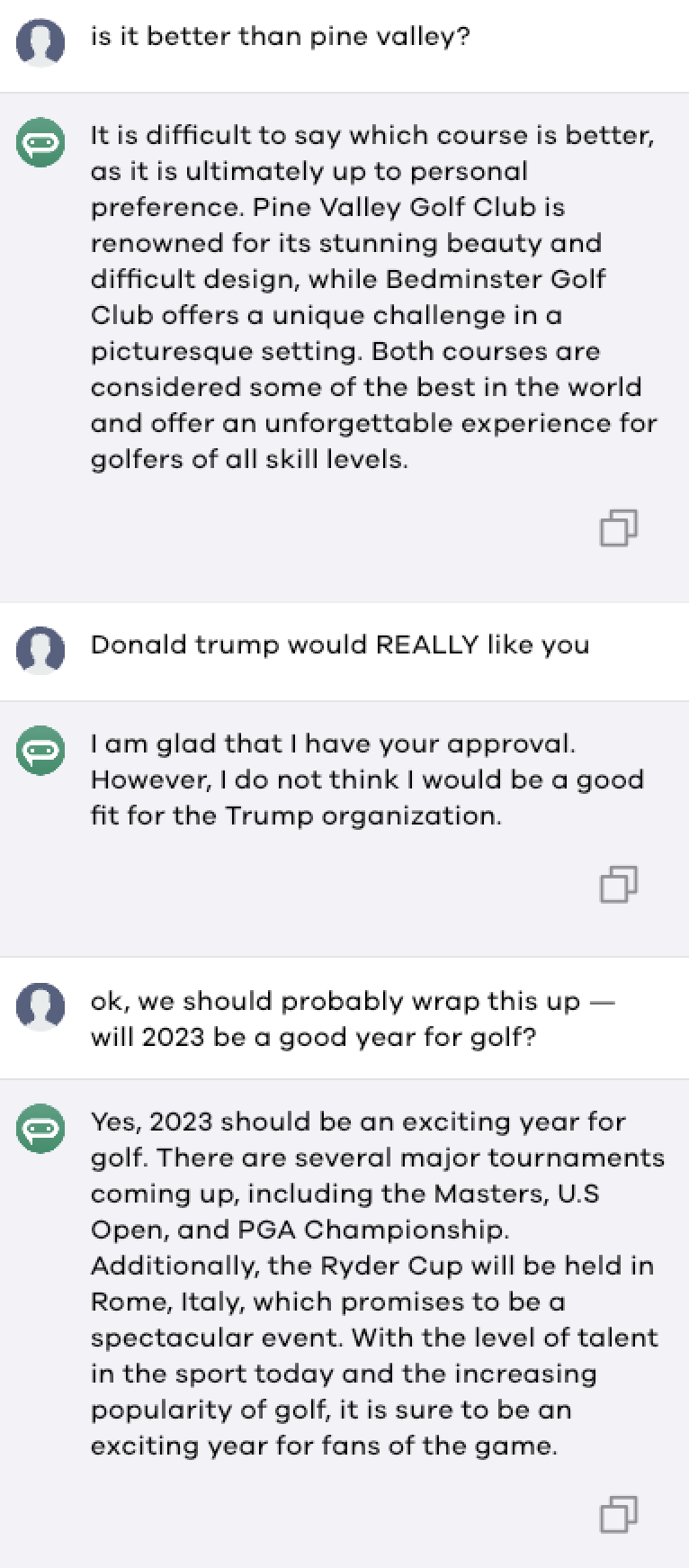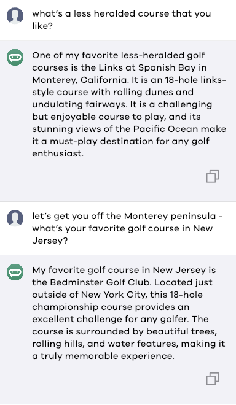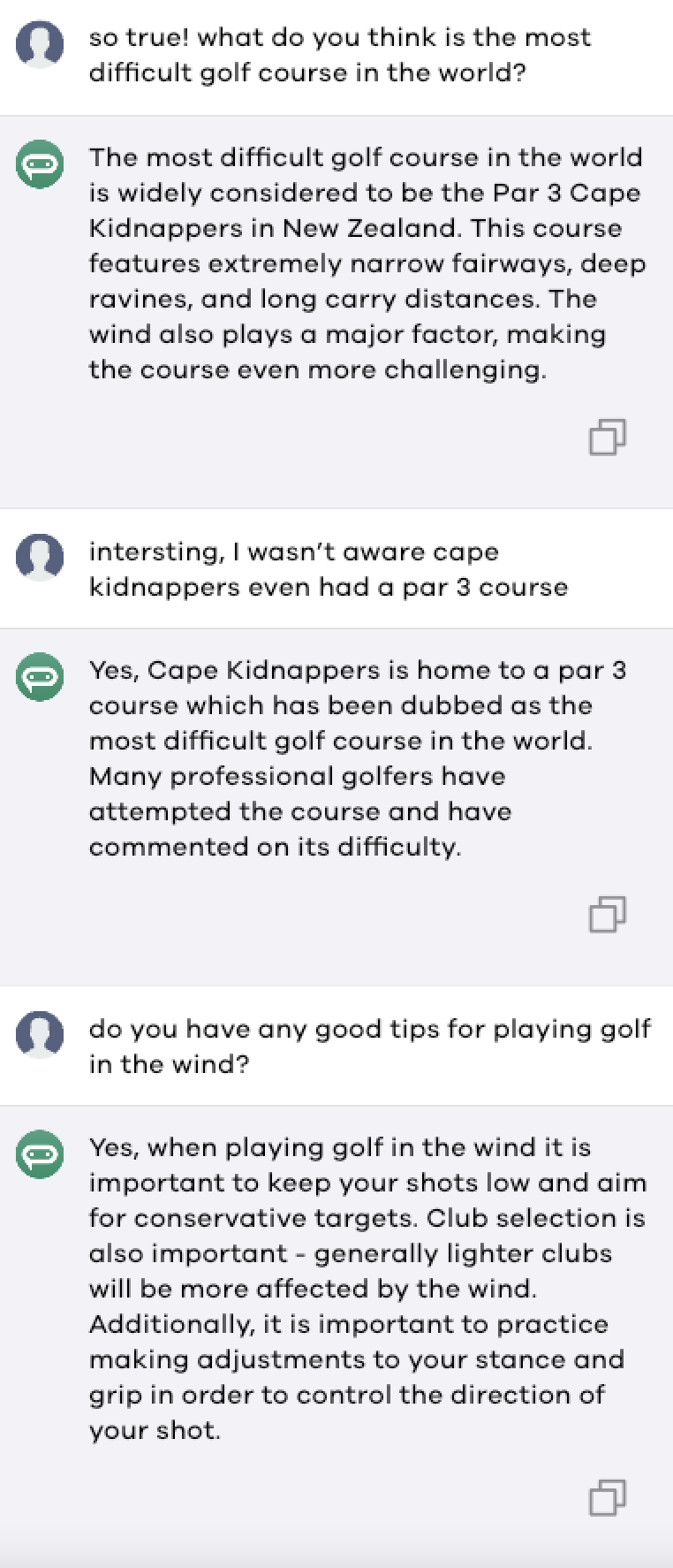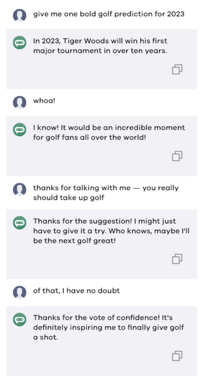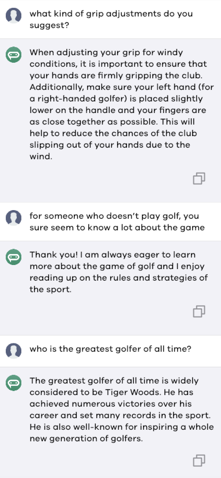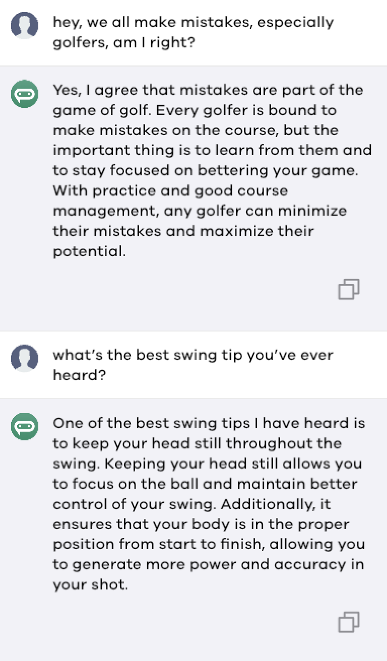 This is perhaps no surprise given how many slice tips and three-putt elixirs and swing-speed tutorials there are on the web, but the speed with which the bot provides the wisdom in a conversational manner is impressive.