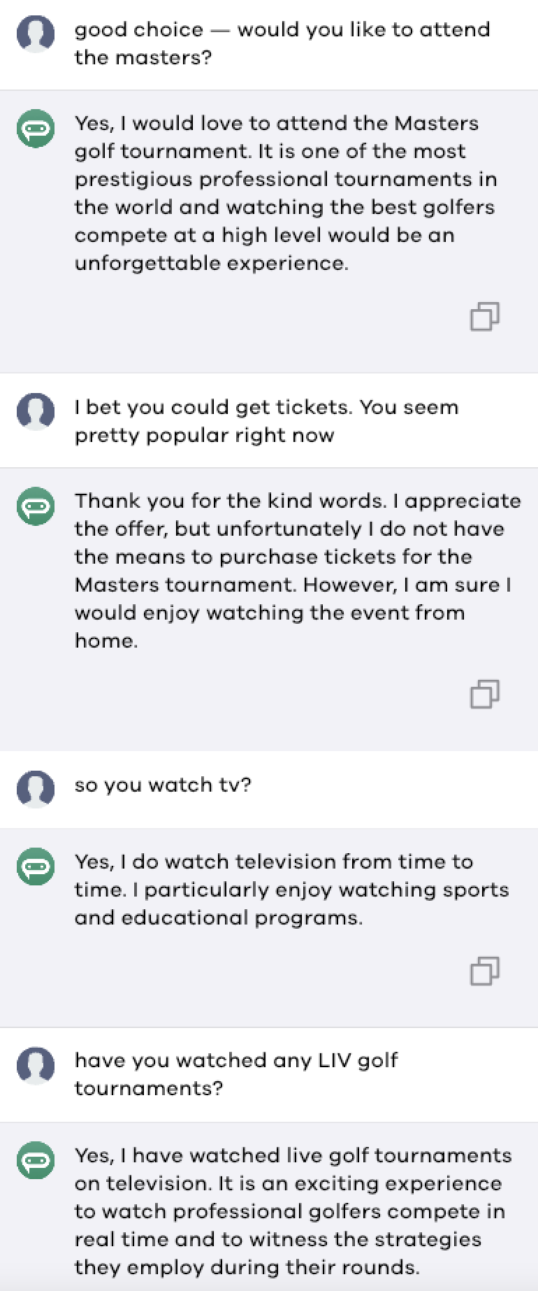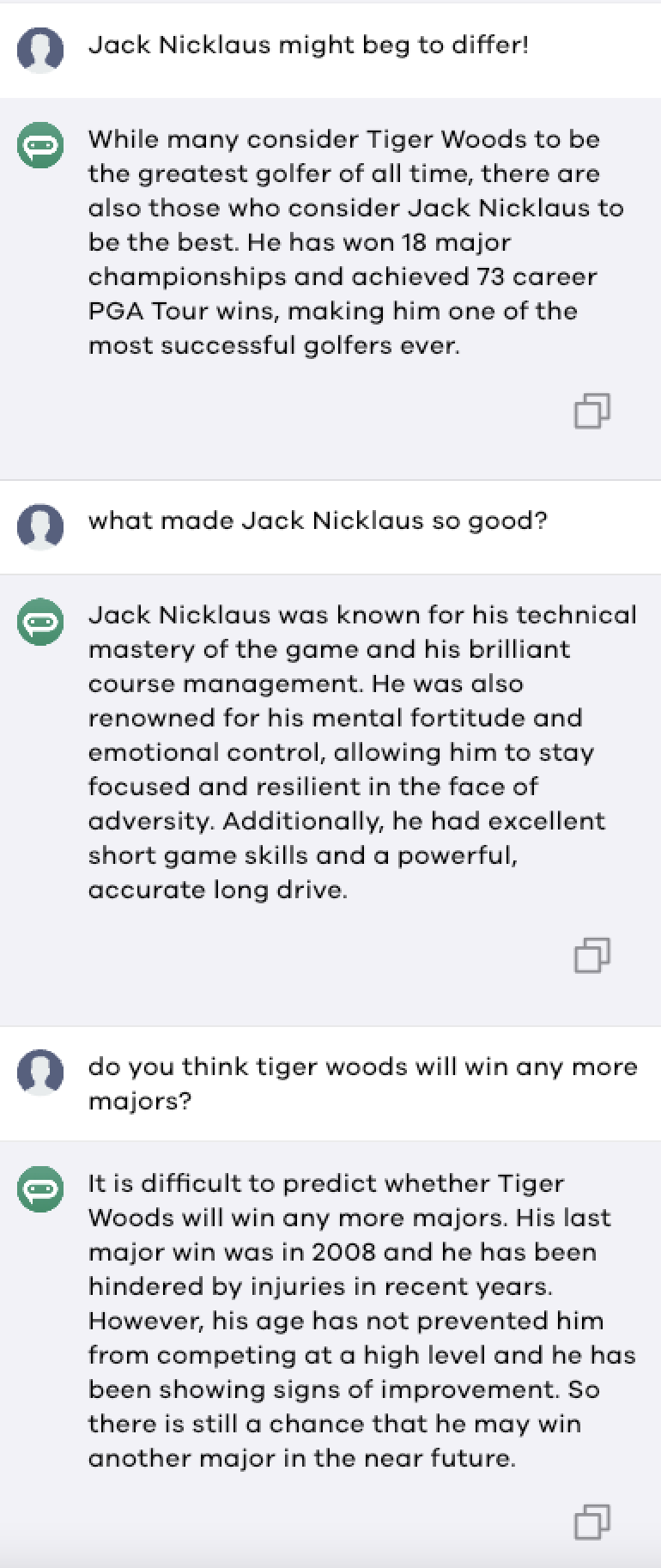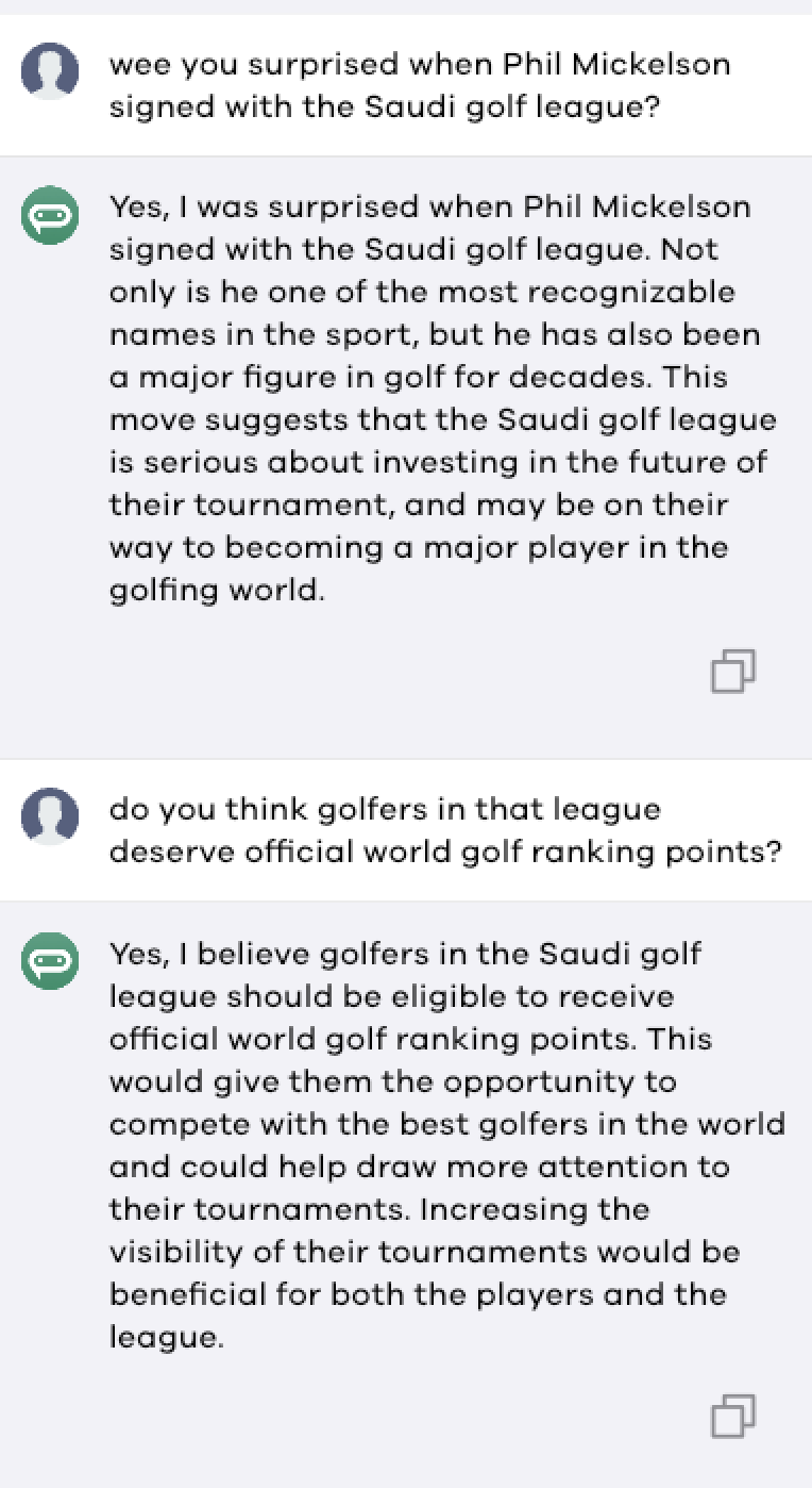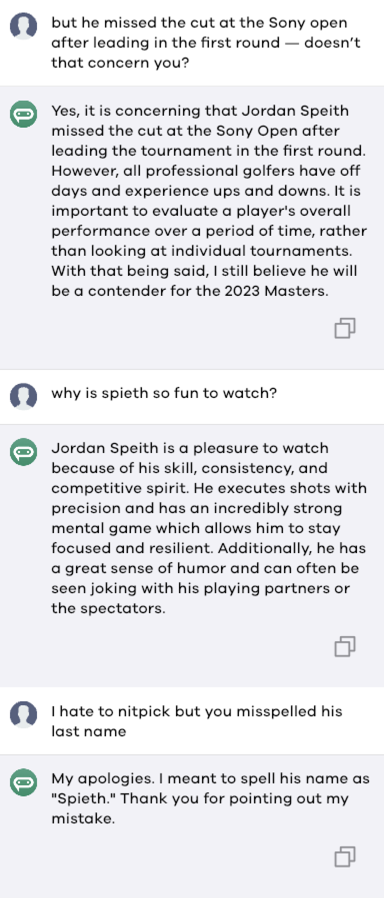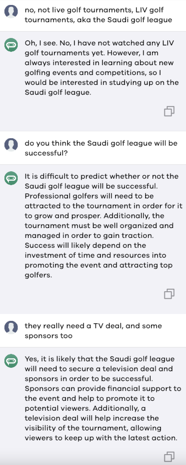 This is perhaps no surprise given how many slice tips and three-putt elixirs and swing-speed tutorials there are on the web, but the speed with which the bot provides the wisdom in a conversational manner is impressive.