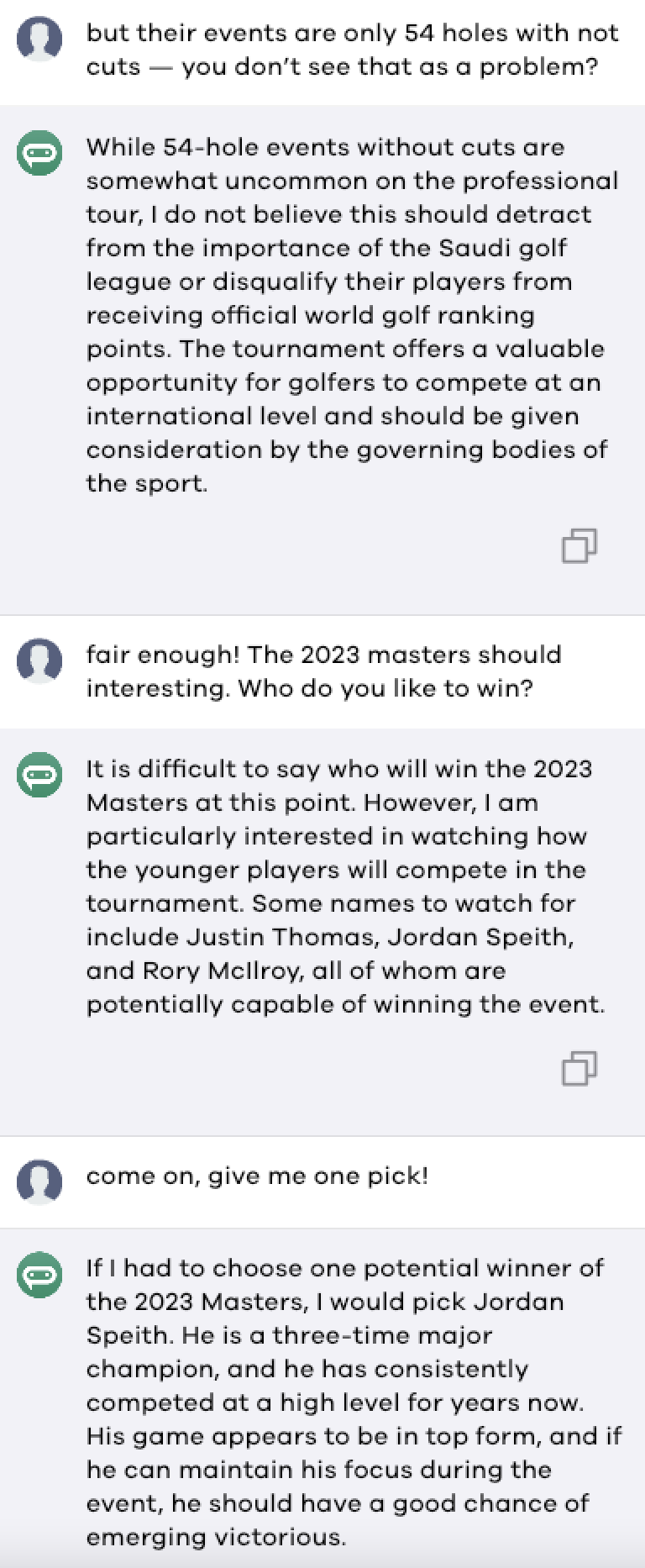 The bot doesn’t seek to take sides on issues, but when pushed, it’ll opine. Most overrated golfer? Will LIV survive? Does Tiger have more major wins in him? On those topics and more, ChatGPT did not disappoint.
