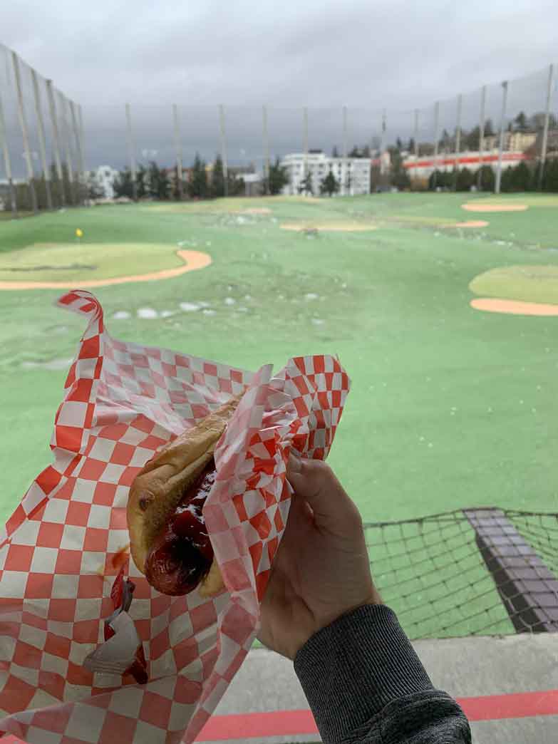 This is a picture from February in Seattle on the second floor of the driving range at the Interbay Golf Center. Golf in any form in February is a super-bonus. Interbay has tremendous hot dogs at reasonable prices. I am a man of simple pleasures. The photo itself isn’t much to write home about; I’m holding my phone in one hand and the hot dog in the other, after all, with a golf bag slung over my shoulder. But yes, that’s a mildly toasted bun.