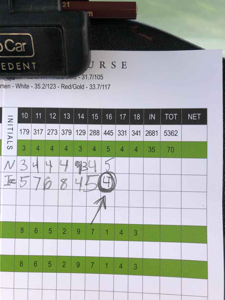 My nephew, the trash-talker. My favorite golf picture of the year also came during my 13-year-old nephew’s favorite golf moment. This year, we played our first round together on a “big” course (which I wrote about here), and on the 445-yard, par-5 16th, at Moor Downs Golf Course in Waukesha, Wis., on Monday, Aug., 2, 2021, I made a par — and Mason made a birdie. After which he took the brown scoring pencil in our cart, wrote down our scores, then drew about 10 circles around his four and scribbled in an arrow pointing up below it. Just in case anyone was forgetting who beat whom that hole. Lord help me when his 18-hole score is lower than mine. Brat. —Nick Piastowski