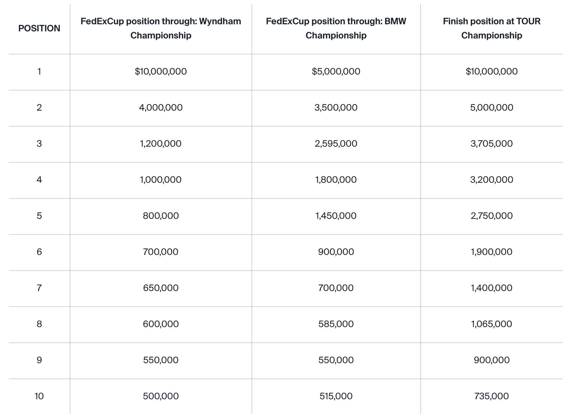 A partial payout list is in the graphic below; you can see the entire Tour Championship purse here.