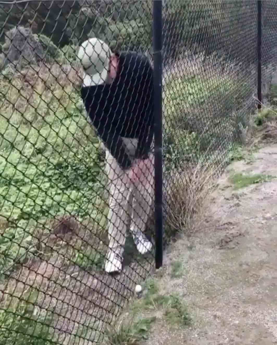 Because of the holes on the fence, he was actually able to make pretty solid contact with the ball. There’s no textbook on how to hit this shot, but it looks like he just took his normal swing and stopped right at impact, sending the ball low and running hot.