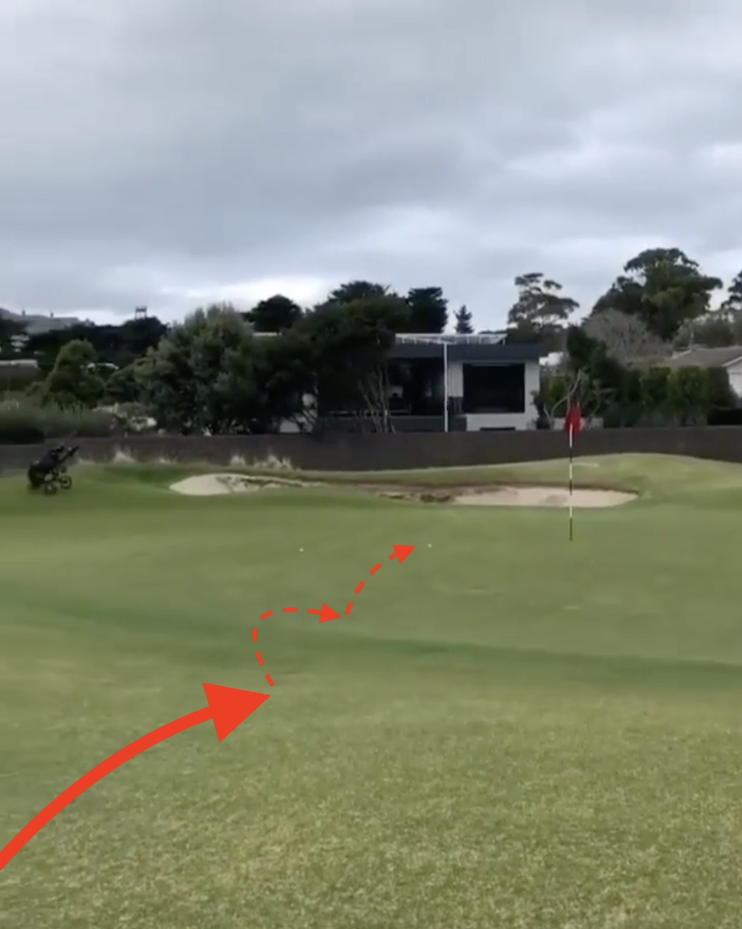 From there the ball bounced directly into a hill just short of the green, bounced up, and released down to a few feet from the hole.