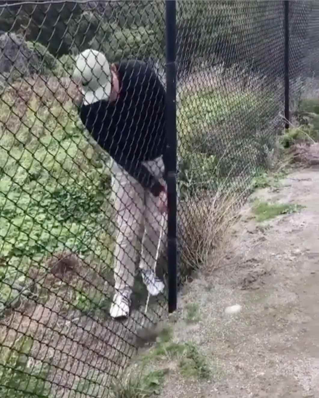 The players’ ball came to rest up against a fence. And when we say up against a fence, we don’t mean sort of close to the fence. I mean, literally, up against the fence. So much so that the only way he could hit the shot was to climb over to the other side and play from there.