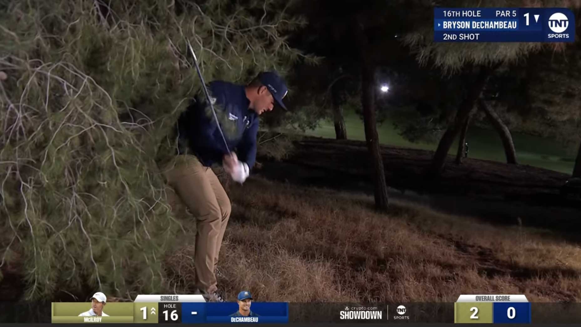 “Welcome to the tournament,” Koepka said sarcastically as they reached the 12th tee. When he and Bryson three-putted the 12th for bogey, it was up to McIlroy to win the session. He did exactly that, easing his 4-footer into the center of the cup. McIlroy stayed hot, birdieing the first two holes of his singles match against Bryson, virtually clinching the match at that point. The Showdown was officially over when Koepka’s birdie putt on the 16th hole missed. (Let the following screenshot serve as a visual for how their night went.)