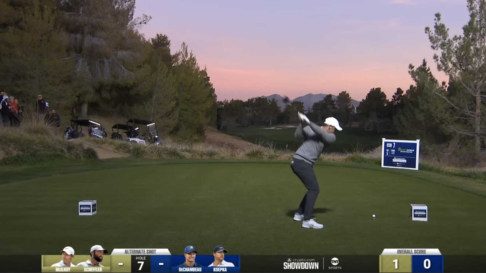 The long awaited PGA Tour vs. LIV Golf battle — that neither tour was directly associated with! — finally arrived Tuesday night in Vegas. Rory McIlroy and Scottie Scheffler took on Bryson DeChambeau and Brooks Koepka at Shadow Creek in a match billed as The Showdown. And over the course of four hours, golf fans saw something they have grown accustomed to not seeing. It was LIV’s best against the PGA Tour’s best in a non-major setting. It was under the lights and with golfers mic’d up. It had to live up to the hype, right?