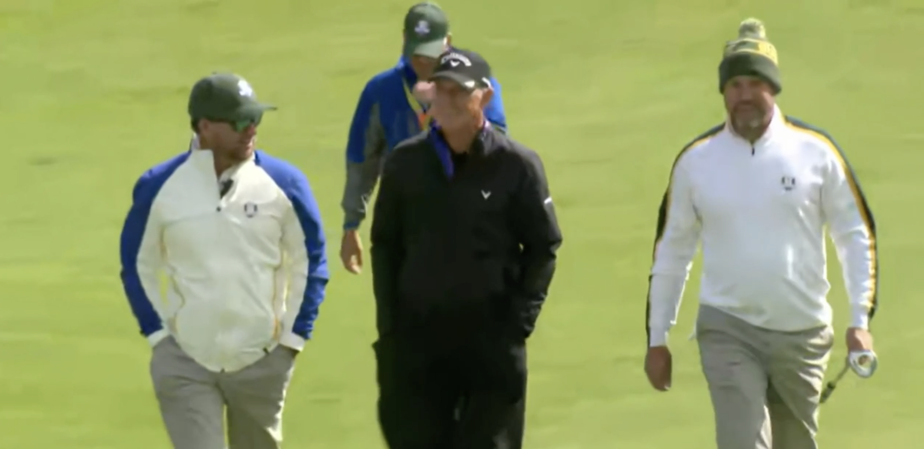 There’s only one exception to the rule: Legendary coach Pete Cowen, who’s dressed in his signature black. Why? Because he’s helping players on multiple teams: Brooks Koepka on the U.S., along with Rory McIlory and Ian Poulter on the European side.
