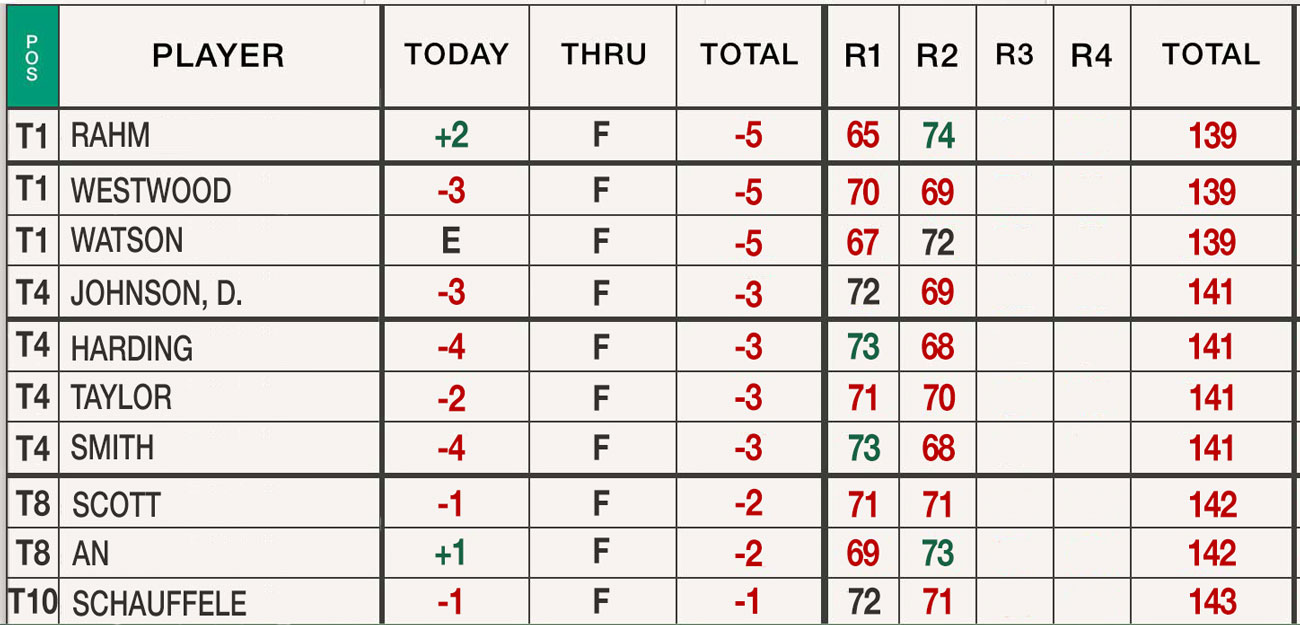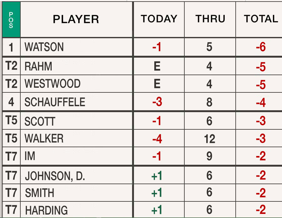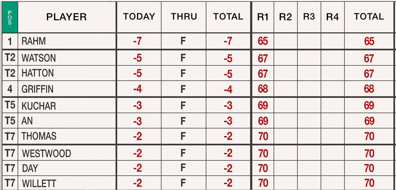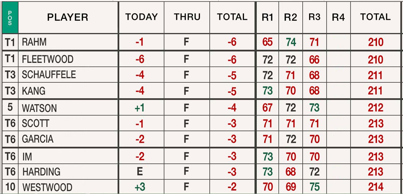 Rahm:       4-4-3-4-4-5-3-4-4 — 35 (-10)