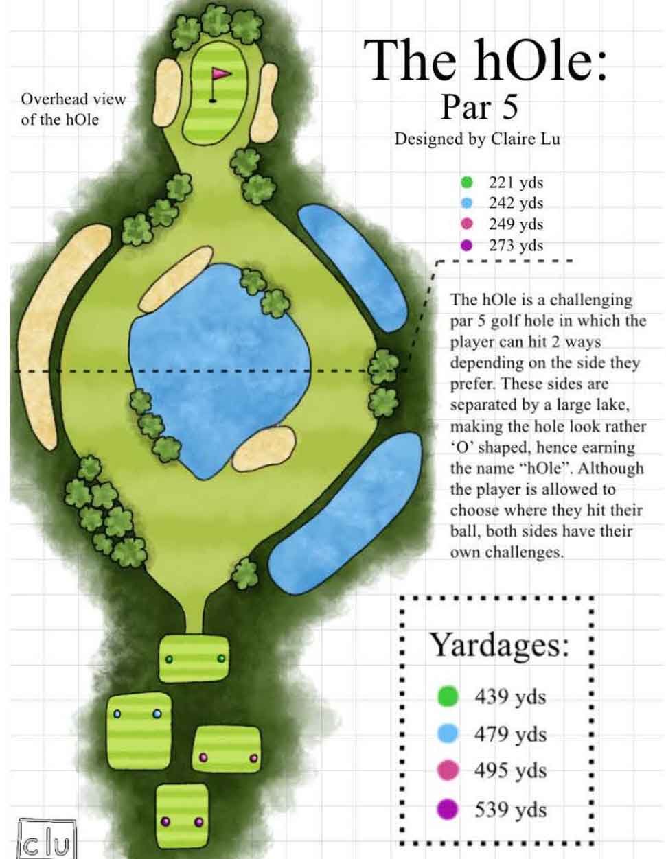 I pictured us being on opposite sides of a lake in a fairway, and all of us playing to the green at the same time.” Claire Lu